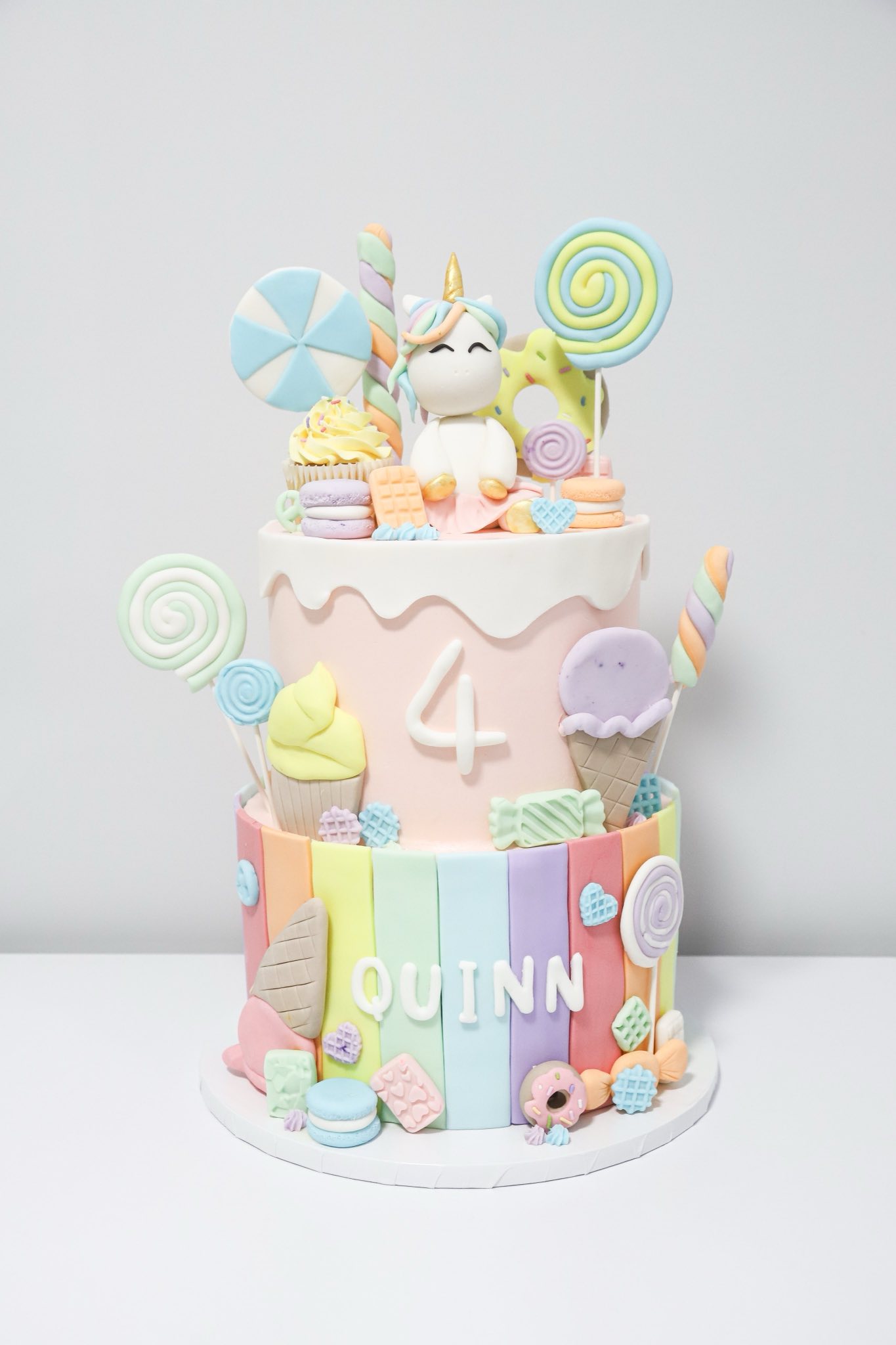 cones appear to float atop a rainbow-striped candy-barrel base, finished with the name “QUINN” in
