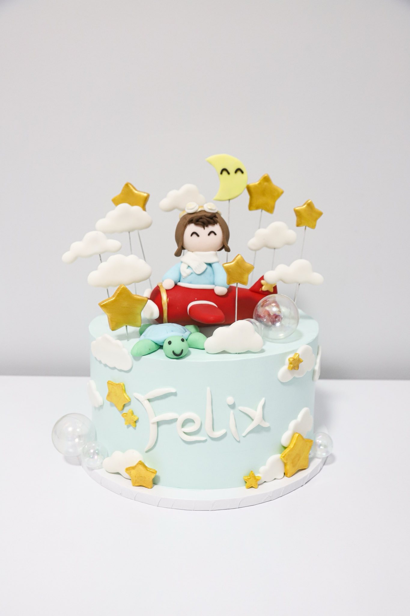 A whimsical tribute to young explorers, this soft blue cake showcases a smiling little pilot in his
